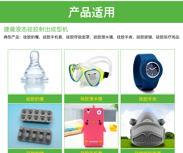 1、多種模壓食品起用液體狀態硅膠材料擠壓成型的穿刺作業管理。 2、刷抹、嬰童生活專工具、兒童生活專工具、體育教育生活專工具、廚房餐廳生活專工具、電商服務等企業的灌洗數學作業。 典例物品:矽膠奶嘴,矽膠安卓手機套,矽膠呼吸系統面具,矽膠潛水鏡,矽膠石英表,矽膠開關,矽膠醫療器械日常用品